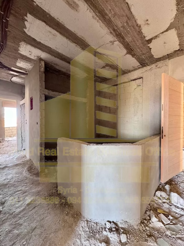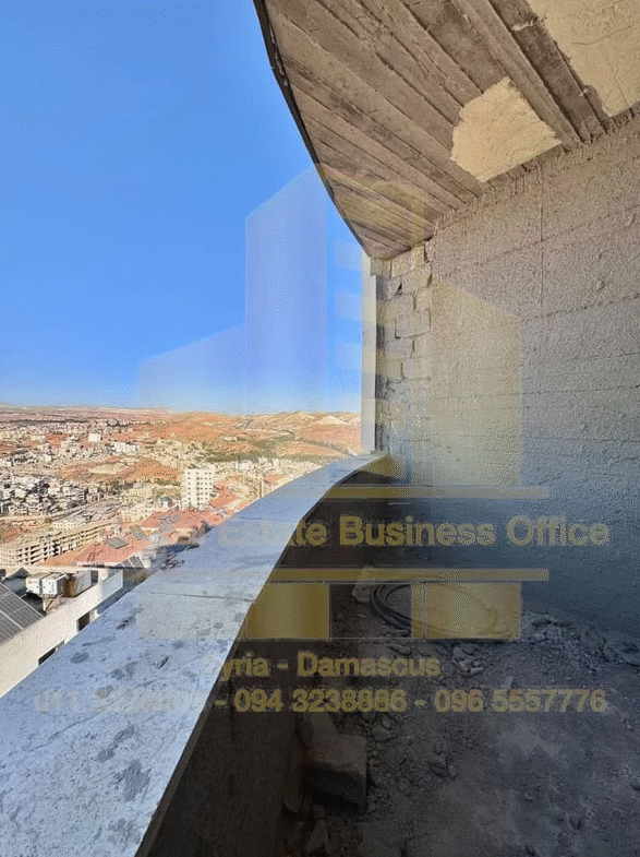 تقع الشقة في الطابق التاسع مع مصعد يعمل على الطاقة البديلة يصل حتى باب الشقة، والإكساء بنسبة 30% (سوادات كهرباء وصحية، طينة، ملابس خشب، علب أبجورات، باب خشبي خارجي).