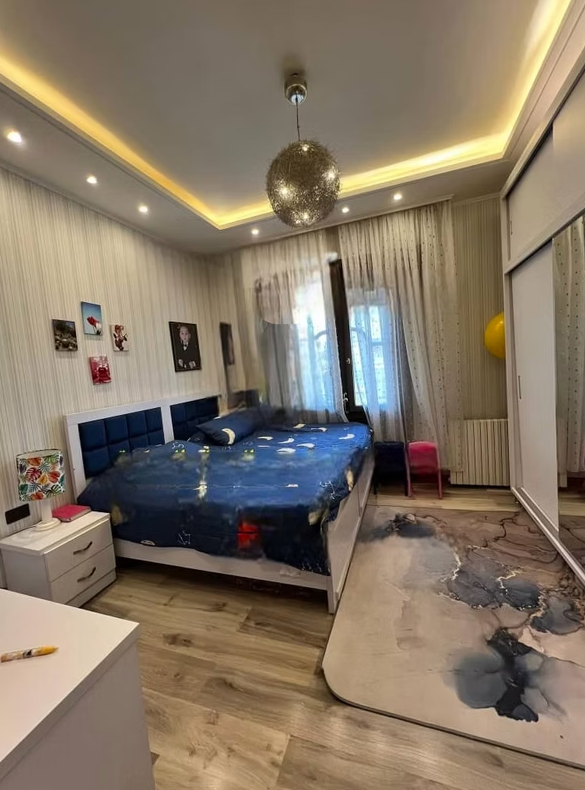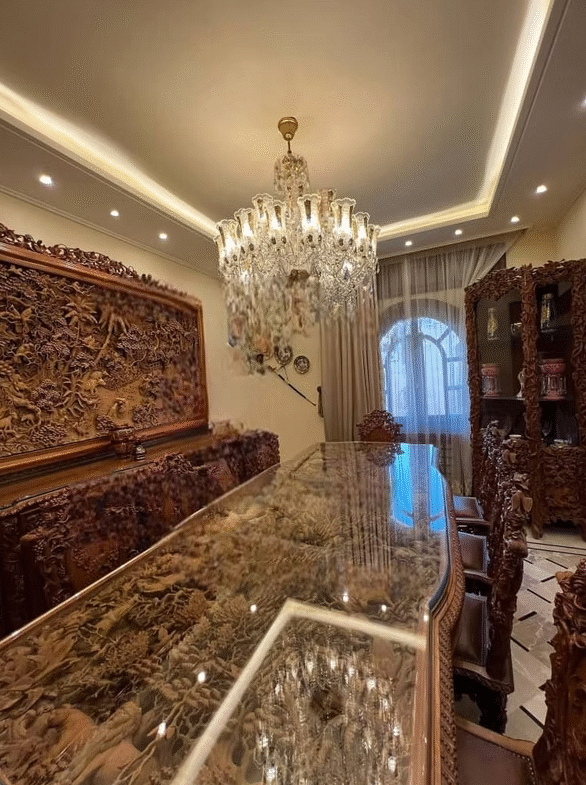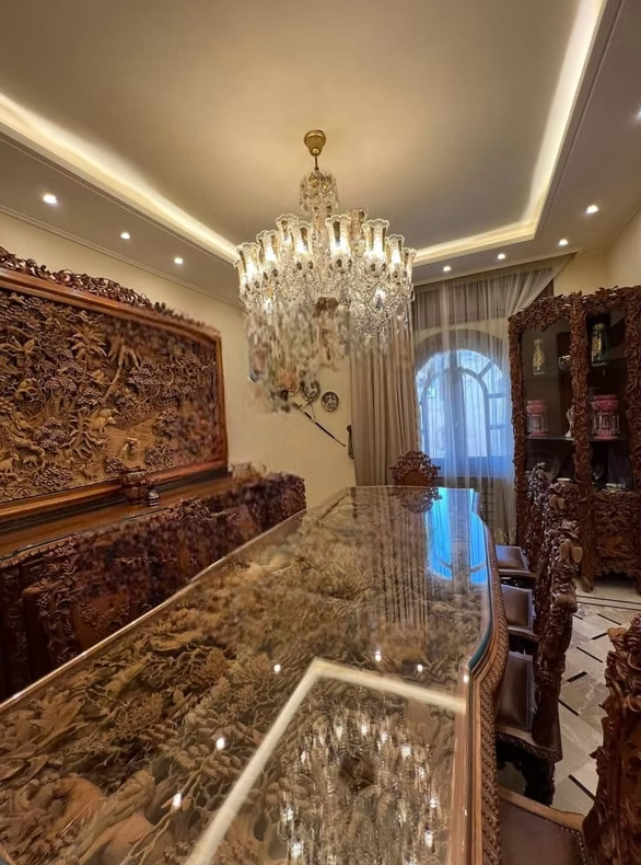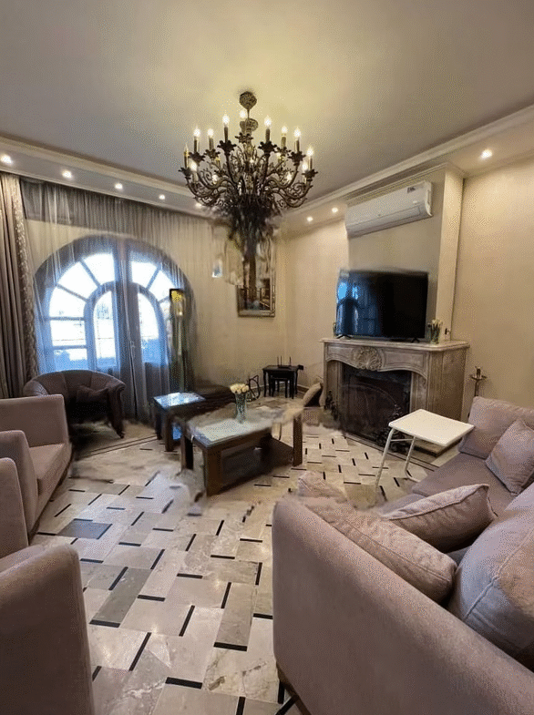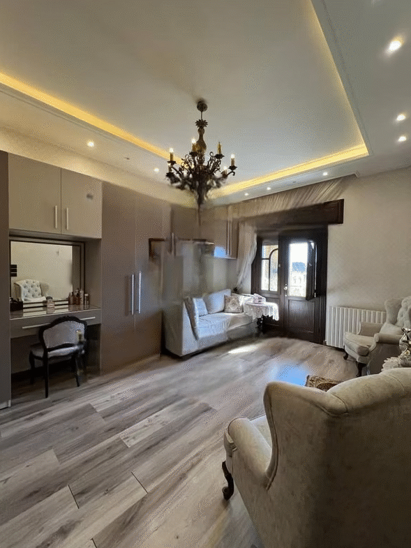 يضم المنزل ست غرف واسعة وثلاثة حمامات تشمل جناحاً للأبوين، إضافة إلى ثلاث صالونات بإطلالة على شارعين توفر إنارة طبيعية وتهوية ممتازة. يتميز الإكساء بطابع كلاسيكي فاخر مع أرض مرمر وخشب سويد درجة أولى وشمينية رخامية من كاريرا الإيطالية مع جبس بورد وإنارة حديثة.